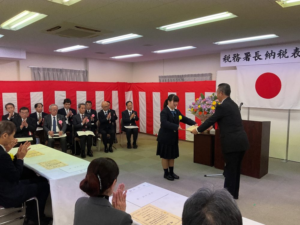 14日、諏訪税務署(諏訪市)において、国税庁主催「税に関する高校生の作文」の表彰式が行われました。本校から6名が入選しており、このたび「諏訪税務署長賞」に入選した2名に対する表彰式が先に挙行され、諏訪税務署長から賞状・副賞が授与されました。表彰式では生徒が自らの作品を朗読、会場の人々がしきりにうなずく場面が見られました。