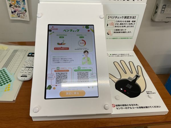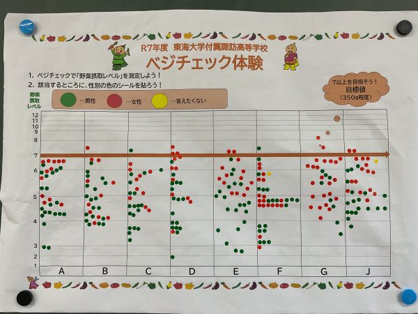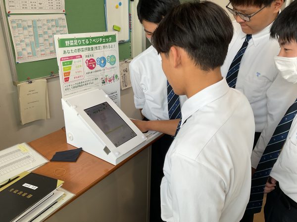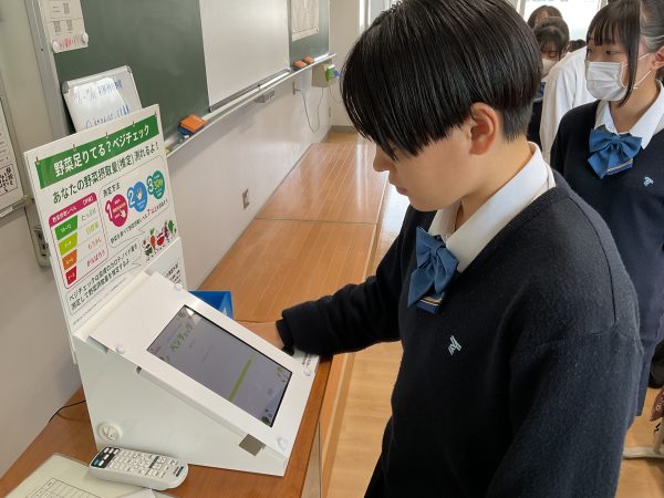 10月10日、2学年の家庭科の授業において、茅野市役所とカゴメ株式会社の協力により、野菜の摂取状況が測定できる「ベジチェック」を実施しました。生徒たちは結果をもとに自分の食生活を振り返り、何が自分には必要でどのような野菜の摂取方法が良いかについて考察しました。日頃の食生活を改善しようとする意識が高まったようです。