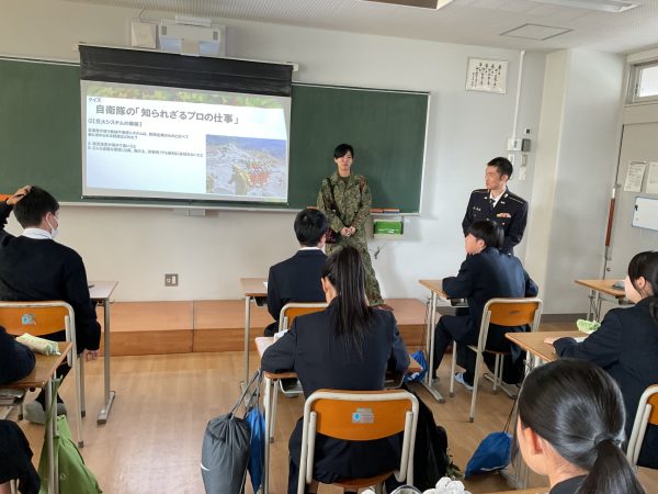 ◆自衛隊の方たちのお話を聞いて、まず自衛隊には国の防衛、災害派遣、国際平和協力活動という3つのミッションがあり、国の派遣では、コロナワクチンの接種など、様々な国と協力して行っていることを知った。大災害が発生した時には、物資を「どこから」「誰が」「いつ」届けたかをしっかり管理していることがわかりました。また、どんな過酷な環境(山脈、空など)でも絶対に途切れない通信技術をもっていて、命を救うためには、そうしたところにも力を入れてやっているのだなと思いました。自衛隊には全員がおなじようなことをやっているのではなく、気象から調理まで幅広い仕事があることを知りました。女性自衛官の方の話を聞いて、良いところ、悪いところ、どちらもあるけれど、他の職よりは全然いいところだなと思いました。生活が安定しているし、しっかりと休みもあるのでいいと思います。「自分の未来は自分で決める」と言われたので迷わず行動していきたい。