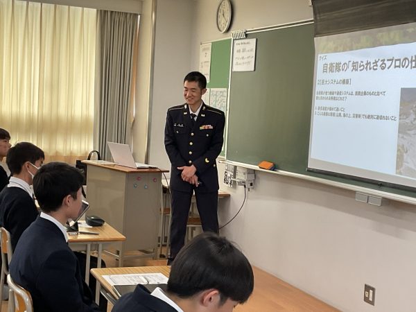 ◆自衛隊の方のお話を聞いて、普段なかなか知ることのできない現場の実情や、自衛官としての使命感の強さを感じることができました。自衛隊というと「国を守る組織」というイメージが強かったのですが、実際は災害派遣や国際平和協力活動など、多方面から人々の生活を支えていることを知り、その活動の幅広さに驚きました。特に災害時には誰よりも早く現場に駆け付け、人命救助や復旧支援に尽力しているという話には胸を打たれました。また、厳しい訓練や規律の中で仲間との信頼関係を築き、常に冷静な判断力と体力を求められるというお話から、自衛官の責任の重さを実感しました。私たちが安心して生活できるのは、こうした見えないところで努力している方々の存在があるからだと改めて感じました。今回のお話を聞いて、自分も社会の一員としてできることを考え、責任をもって行動する大切さを学びました。