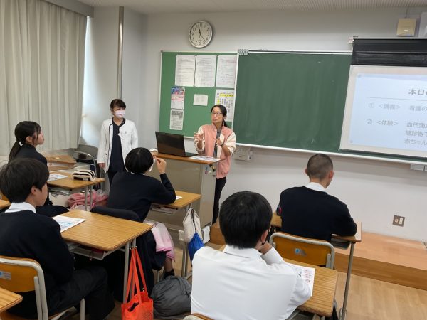 ◆私は今日、看護の体験、お話を聞いて、人と関わるについて少し興味を持ちました。看護と聞くと、病院だけのイメージがあったのですが、それだけではなく、いろいろなところで活躍しているということを聞いて、少しイメージが変わりました。私たちは岡さんから生まれてきているから、あの大きさの子がお腹の中にいると思うと、すごく大変だなと思いました。看護体験をして、いつも見たり、されたりしていたことを実感できたのはいい経験でした。人に関わることは、すべてが一緒ということはありえないということを心に留めておきたいです。私は看護の仕事に就くことは考えていなかったのですが、少し興味で持てました。少し怖い気持ちもありますが、自分の事でもあるので気にかけていきます。