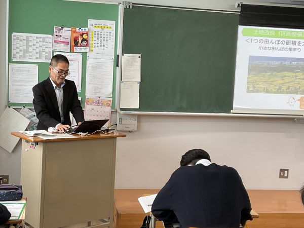 ◆日本の食糧と農業についての講義を受けた。公民科でも学んだ通り、日本の「食料自給率」は(ものにもよりますが)低いことがわかった。食料自給率の種類の多さに驚いた。日本のカロリーベース総合自給率は38%で、残りの62%は輸入しているということに対して、「大丈夫なのかな?」と思った。人口が増加することにより、自分たちが食べるものを育てるための穀物が今まで以上に必要になる。地球温暖化だけでなく、価格高騰や家畜伝染病など、輸入や今後についての不安がたくさんあることがわかり、将来どうなるか不安になった。基幹的農業従事者が減少するのと同時に平均年齢が高くなり、農地面積も減ってしまっているのは大変なことだと思った。日本の農業に対する課題はたくさんあるのだけれど、新しい取り組みを始めている農家さんもいて嬉しく思った。「スマート農業」についてはおもしろい技術だなと思った。今起こっている問題(課題)について詳しく知ることができて良かったと思う。日本の現状について知る機会となり、良かった。また、「農業・農村の有する多面的機能」という項目がおもしろかった。暑さを和らげるということがあることを知らかなかったから驚いた。「みどりの食料システム戦略」という言葉を初めて聞いた。家に帰ったら、もう一度自分で調べてみようかなと思った。SDGsもそうだが、様々な目標が「2050年までに○○」というのは、何故か気になった。今度買い物に行くときには「みえるらべる」というものを探してみたい。まだ見たことはないが、意識して探したい。公民の授業で学んだように「地産地消」が大切だなと思った。新鮮なものも食べられるし、環境にも優しいから、とても良い取り組みだなと感じた。今日の講義では今まで知らなかったことだけでなく、知っていたことの理解を深めることもできた。