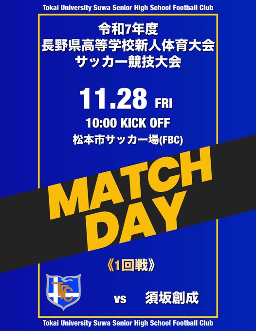 「令和7年度長野県高等学校新人体育大会サッカー競技大会」の日程・会場が決定しました。1回戦は須坂創成高校と対戦します。11月28日、において10:00キックオフです。