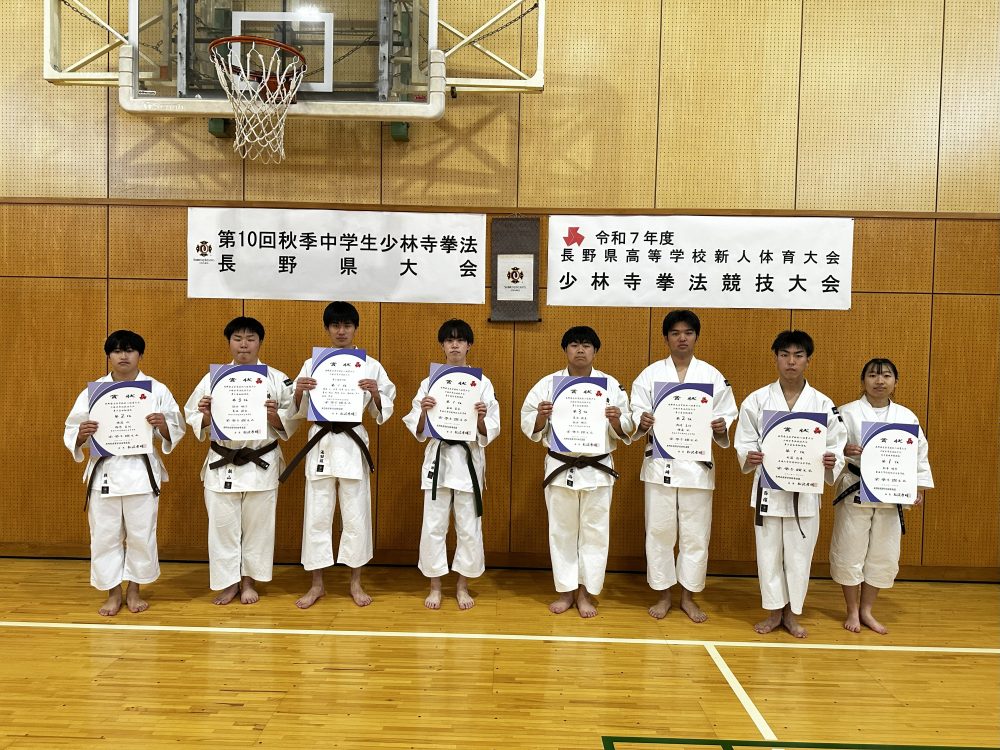 11月23日、本校を会場として開催された「令和7年度長野県高等学校新人体育大会少林寺拳法競技大会」において、男子団体演武で得点254点で優勝し、来年3月に開催される「第29回全国高等学校少林寺拳法選抜大会」への出場が決定しました。個人成績は次のとおり。男子規定単独演武 1位244.5点 / 男子自由単独演武 1位249.5点 / 女子自由単独演武 1位257.5点 / 男子自由組演武 3位 246点 / 男子自由組演武 2位250.5点