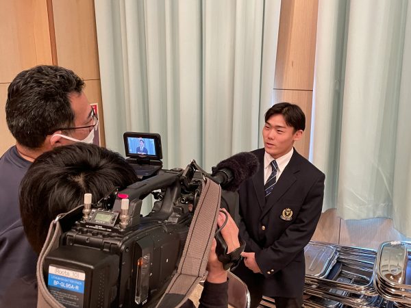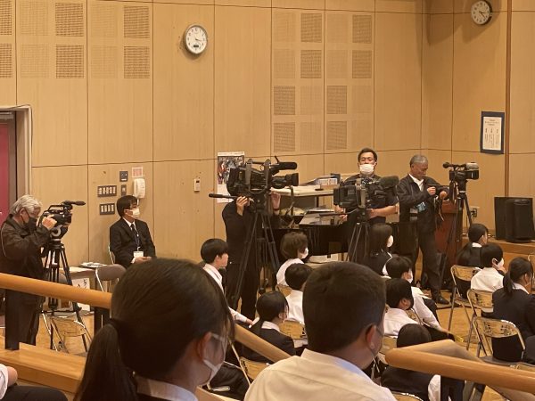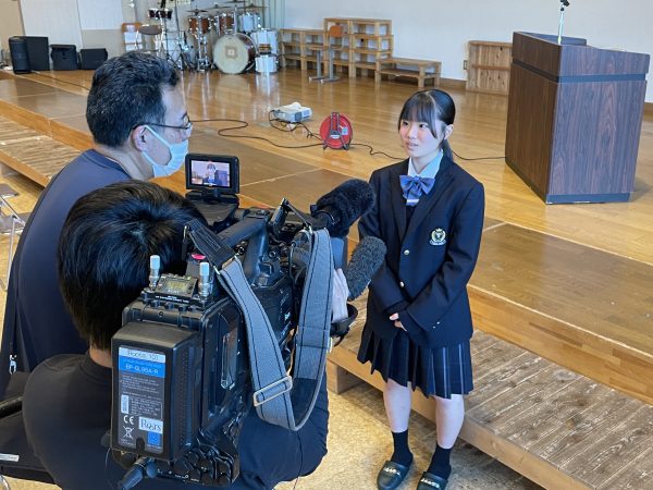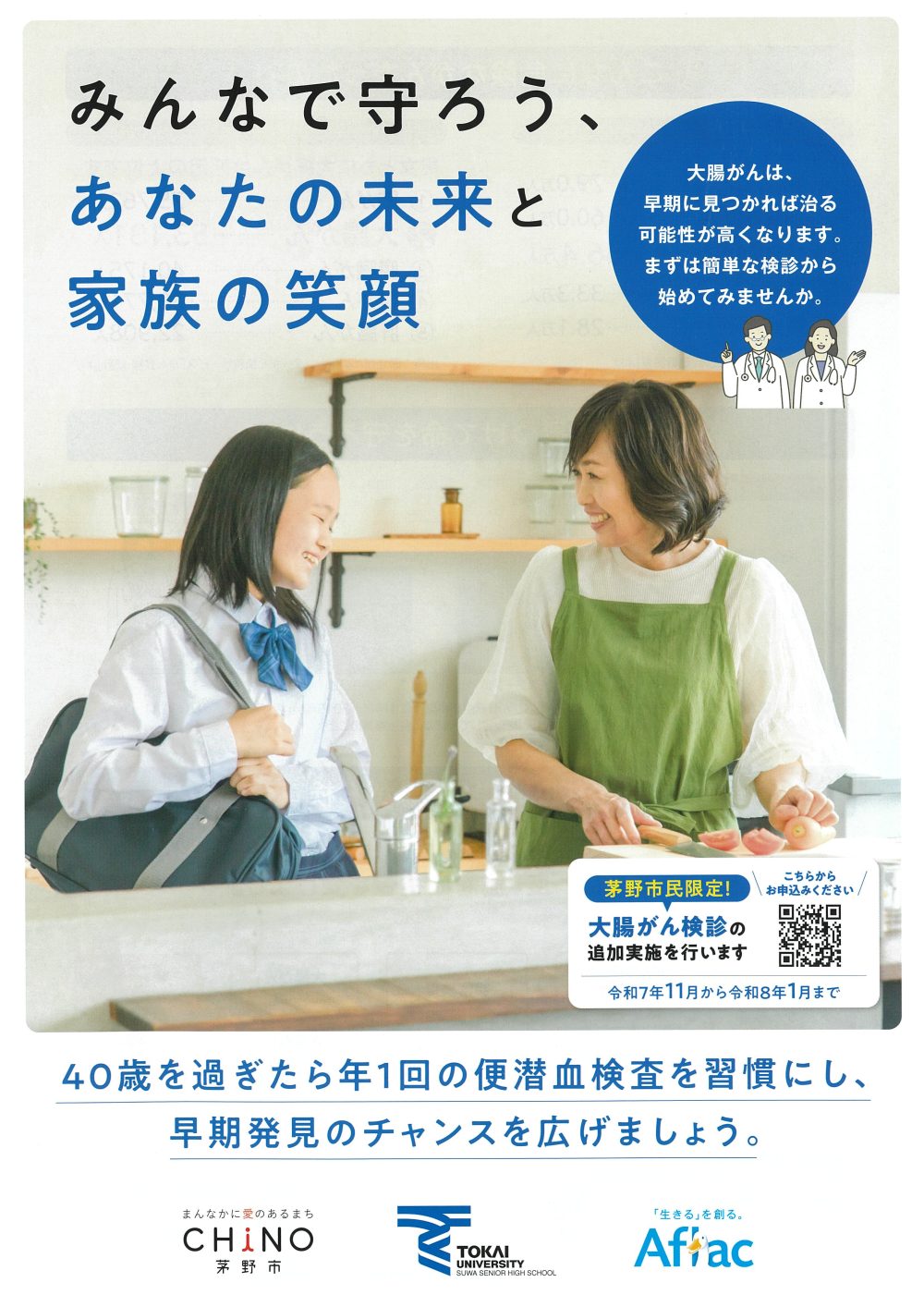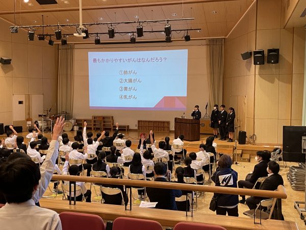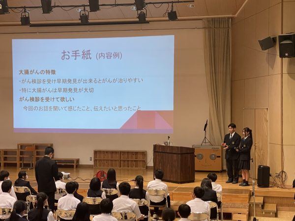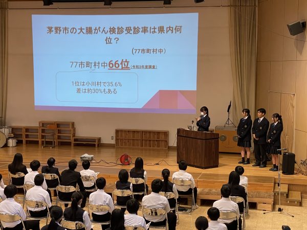 11月28日、2年サイエンスコース・情報班の探究活動についてのテレビ追跡取材が終了。生徒たちの活動は、abn長野朝日放送の年末特別番組で放映されます。この日、茅野市立北部中学校に出向き、中学1年生に向け、がん検診の重要性についての講演を行ないました。また、TBS、abn、LCV、信濃毎日新聞、長野日報、茅野市広報など、会場に駆けつけたメディアの取材にも対応しました。理数探究活動の紹介、大腸がんについて、検診の重要性などを説明し、最後に中学生一人一人にとって大切な「大人」(保護者や先生など)に受診を促す手紙を書いてもらいました。情報班は、「現在の受診率6%から50%にすることを目標とし、「子が親を動かす」ことをコンセプトに、若年層を対象とした啓発活動を今後も続けていく」としています。この研究活動には、諏訪中央病院、Aflac生命保険会社スマートシティ共創部、茅野市役所のご協力をいただいております。今回、生徒たちが制作した検診推進のフライヤーが配布されました。特番の詳細は後日お知らせいたします。