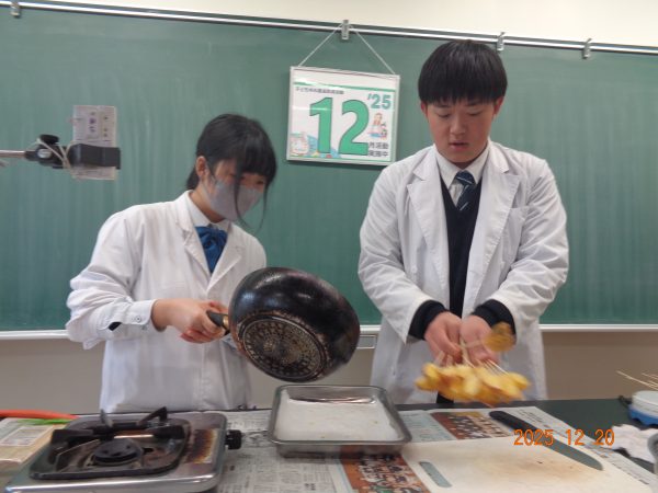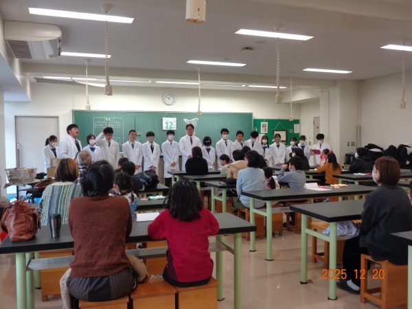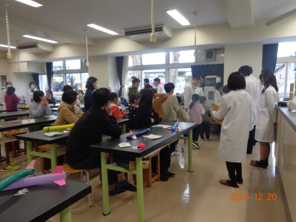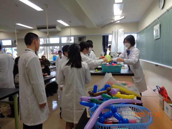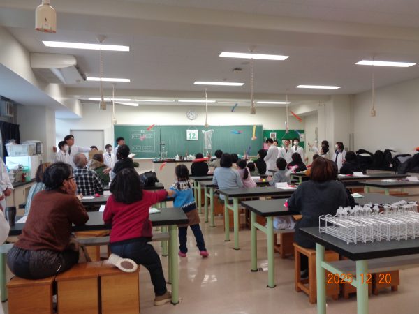 12月20日、科学教室を生物実験室にて開催しました。このイベントは子ども夢基金助成活動の一環で、地域の子どもたちにサイエンスの楽しさを無料で伝えたいという科学部の思いから、今年で2年目の実施となります。当日は親子約30名が参加し、ホバークラフトやバルーンロケット、ペットボトル空気砲、熱気球の実験などを楽しみました。特にサイエンススイーツのりんご飴は大人気で、砂糖がカラメル化によって変化していく化学反応に子どもたちは興味津々でした。