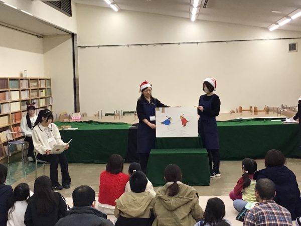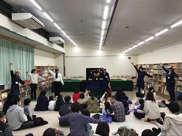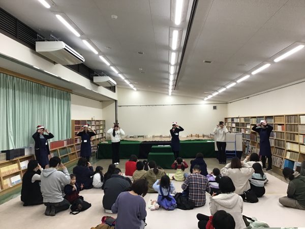 12月20日、茅野市図書館において、児童教育学部に進学する生徒と図書館職員によるクリスマスの特別おはなし会が開催され、クリスマスに関連した大型絵本の読み聞かせや手遊び、パネルシアターなどを楽しみました。最後に、わらべ歌の「さよならあんころもち」を全員で歌い、プレゼントが配布されました。