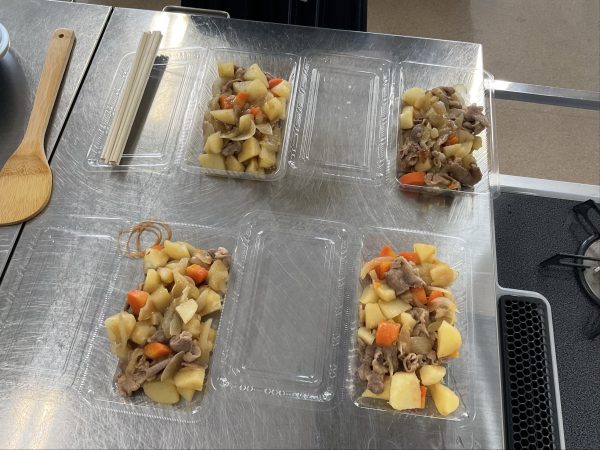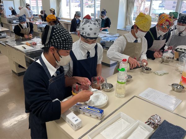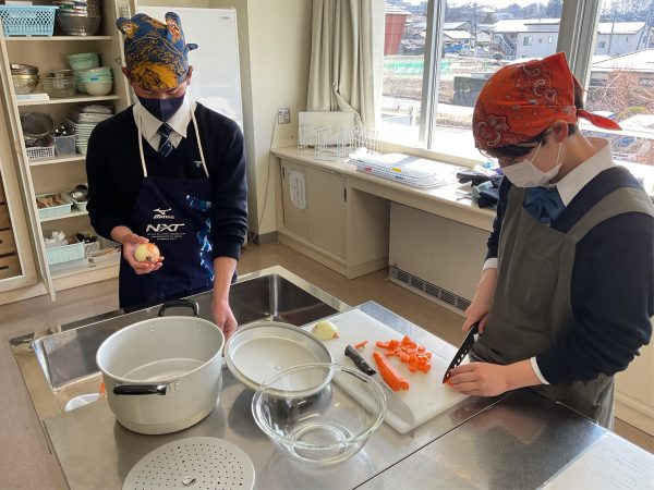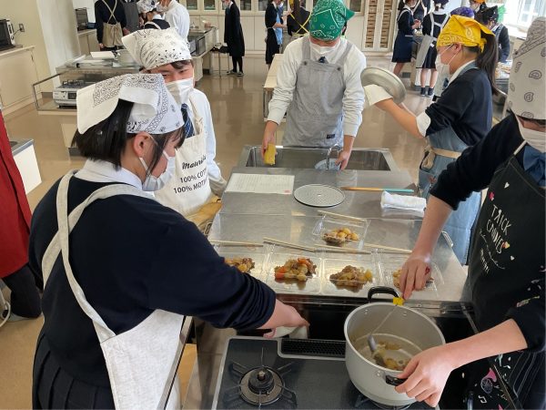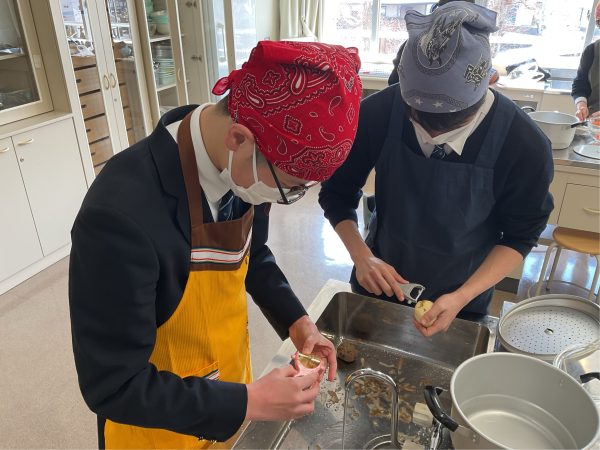 2学年家庭科の調理実習で、一般的に人気のおかず「肉じゃが」作りに挑戦しました。ジャガイモの芽を丁寧に取り、安全にも気を配りながら下ごしらえを行いました。電子レンジも活用して時短を工夫し、調理開始から片付け終了までを、50分弱で行いました。だしのよい香りが広がり、食欲をそそる一品に仕上がりました。卒業後に進学し、一人暮らしがほとんどの生徒たち。親の偉大さを知るでしょう。