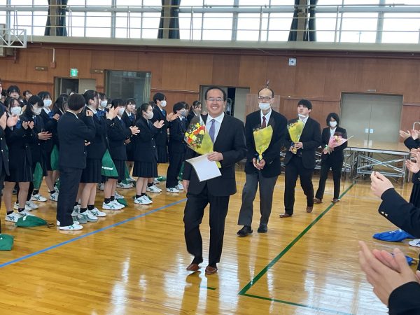 3月19日、2025年度修了式が挙行されました。中村校長から今年度の総括と評価、来年度の高校生活への期待とエールが送られました。春休み中に全国大会に出場する男子ハンドボール部、柔道部、少林寺拳法部の壮行会では、各クラブ代表生徒の力強い挨拶に生徒会長から激励の言葉。続く離任式では、異動・離任される教職員から挨拶がありました。2026年度の始業式は4月8日です。2時間目から特別時間割で授業を行いますのでお忘れなく。
